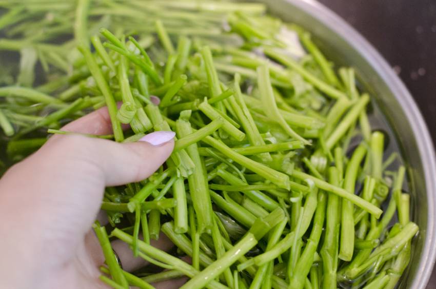 Đối với rau muống, bạn cần nhặt bỏ hết phần lá và chỉ giữ lại phần cọng rau muống mà thôi. Cần phải cắt bỏ phần cọng già, giữ lại cọng non và cắt khúc dài chừng 3cm. Sau khi sơ chế xong thì bạn cho rau vào chậu nước muối pha loãng rồi ngâm 5 phút. Sau đó, bạn vớt rau rồi rửa lại bằng nước lạnh, để rau ráo.